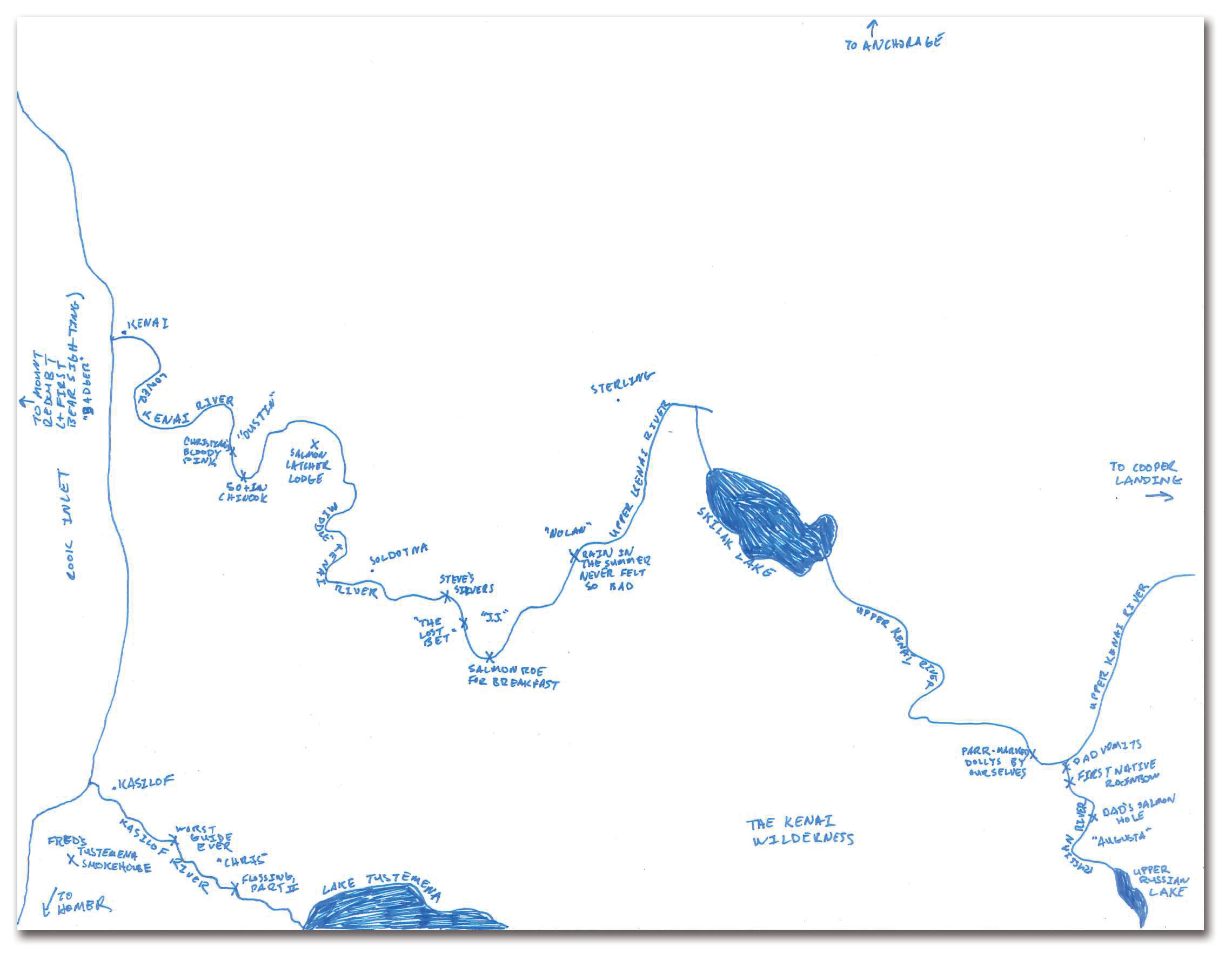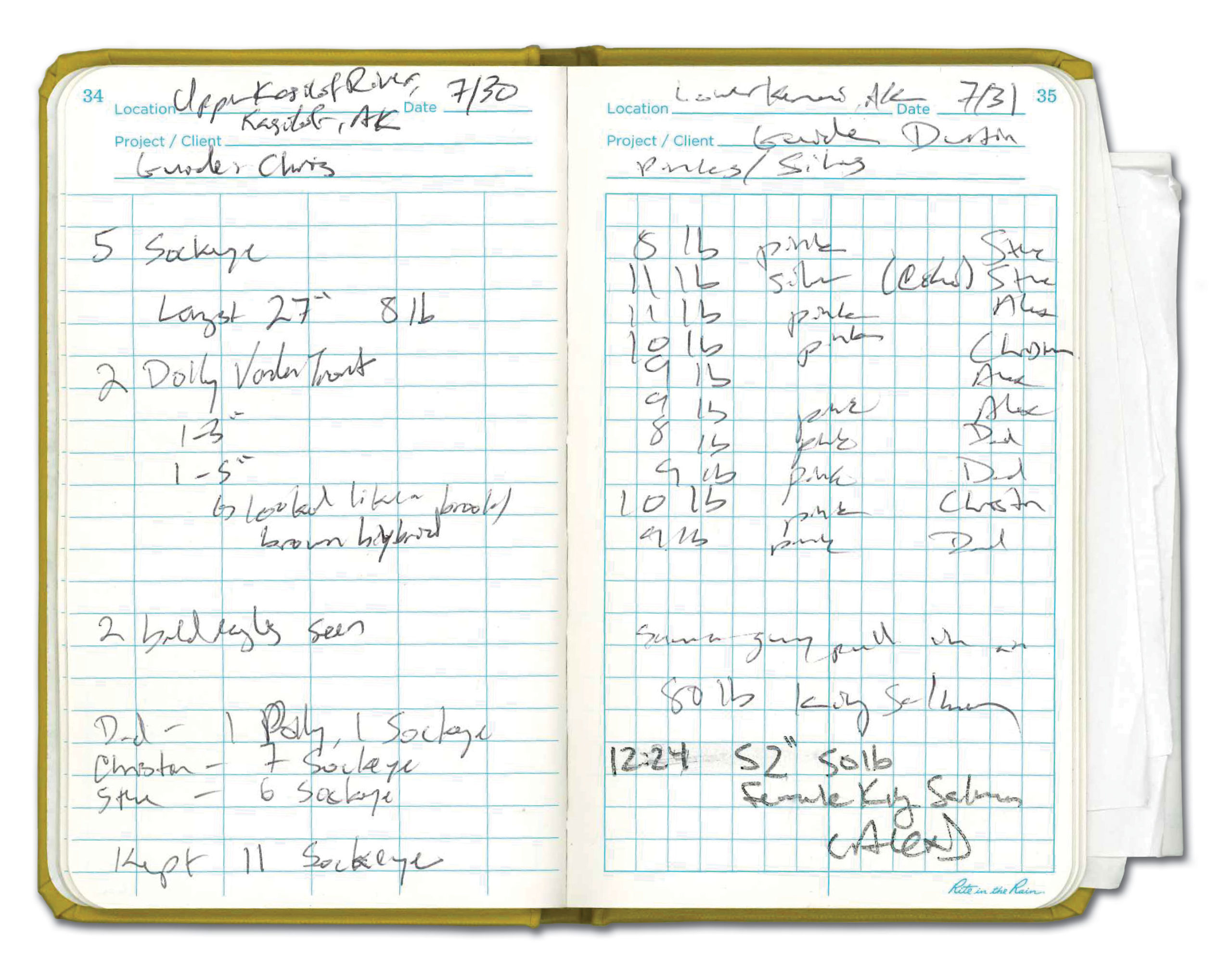 In the breast pocket of his canvas overshirt, which was stained with roe, mud, and blood, he kept a notebook that held his own hand-drawn maps of the bends and eddies of the Kenai, where resting salmon were likely to stack up before moving upriver to their spawning redds. Different species would congregate in different parts of the river, and at different times as well. In between spitting rockets of tobacco juice into the river, Dustin noted that notebook-keeping was common practice among the guides. Each of them came to give their own names to their favorite troughs and runs. It was crucial to update these maps on a tidal river like the Kenai, which changed not only year to year, but between tidal cycles. McPhee echoes this, too: “A stream course in Alaska, writhing like a firehose, can rapidly put a map out of date.”