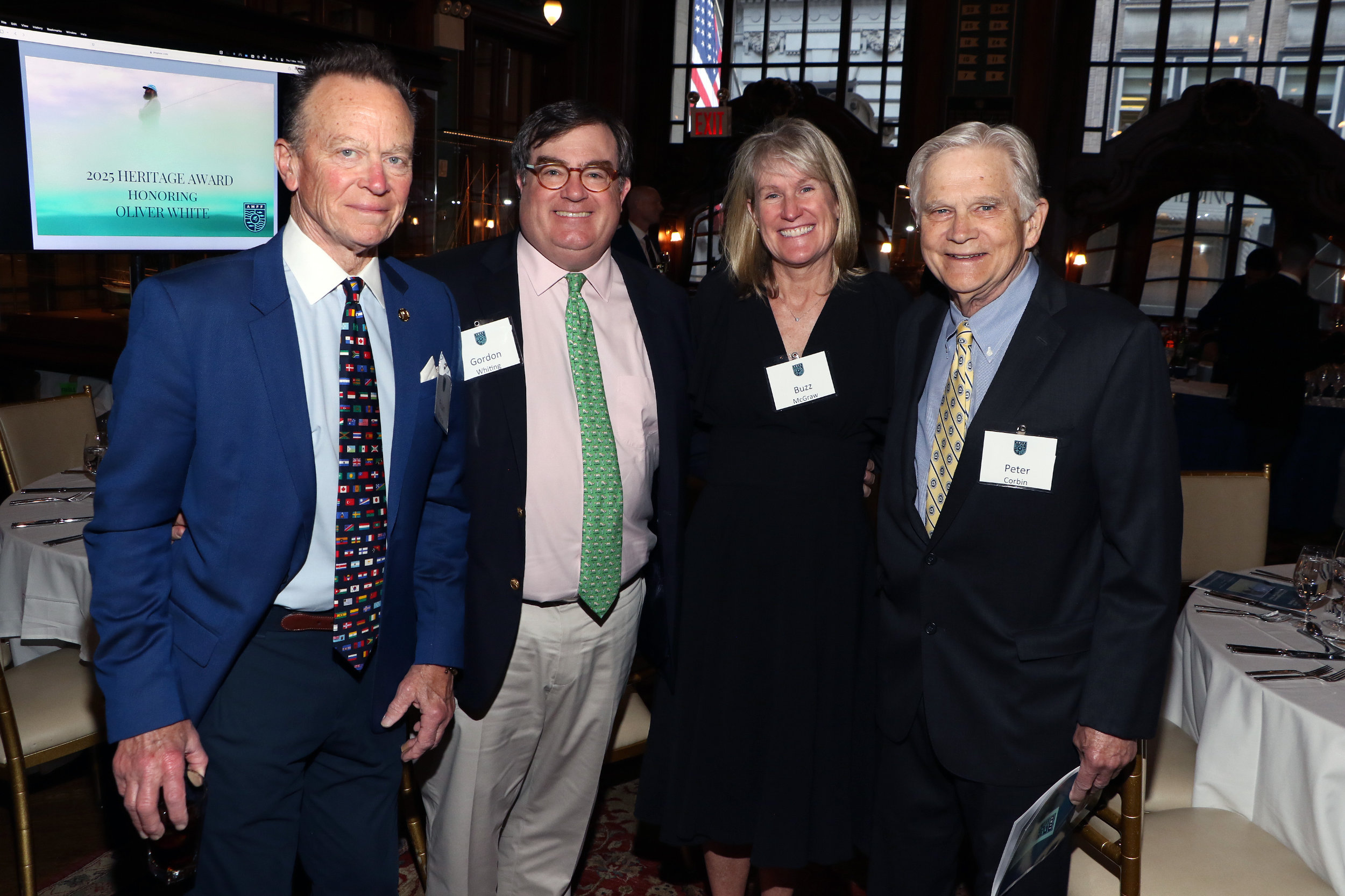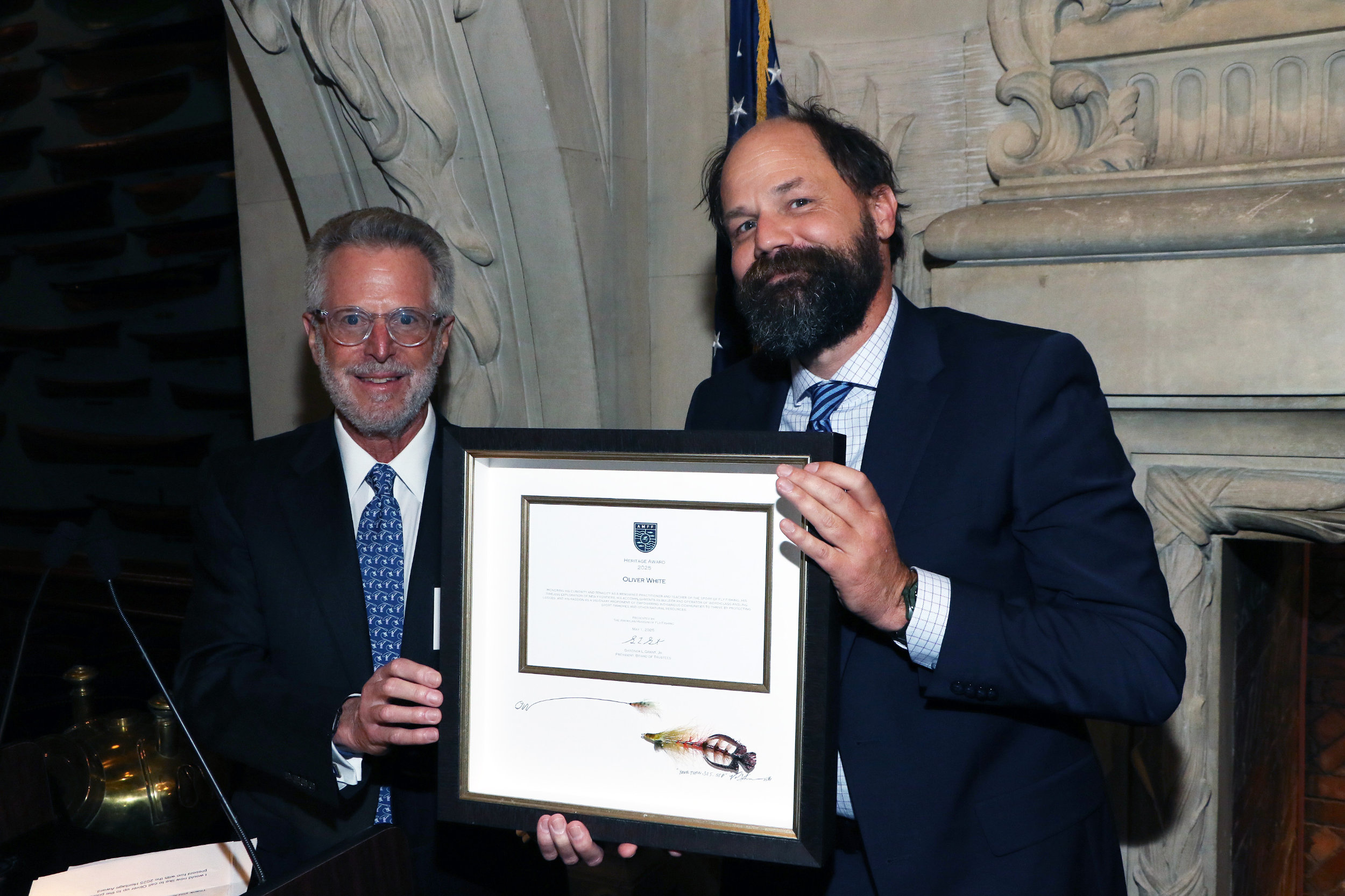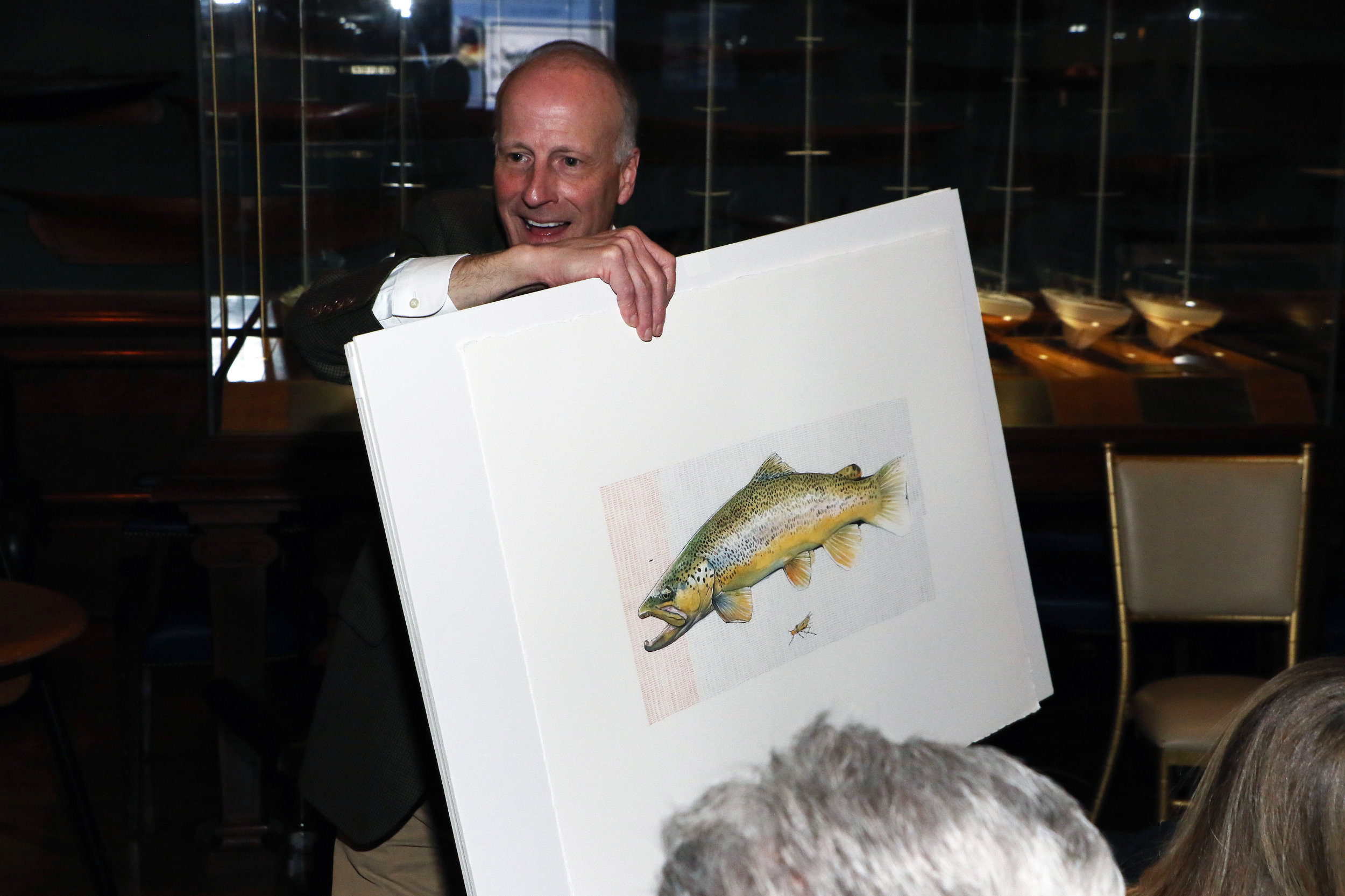 The 2025 Heritage Award honoring Oliver White was held before a sold-out crowd in the elegant Model Room of the New York Yacht Club on May 1. During the lively reception, artist Mike Sudal put the finishing touches on a painting of a Brown Trout that was later auctioned off. Master of ceremonies, AMFF President Gardner Grant Jr, welcomed everyone and shared a surprise tribute video made for Oliver featuring congratulatory and heartfelt messages from some of the most notable and passionate anglers, including Jimmy Kimmel who offered a glimpse into how their relationship started and his admiration for the way Oliver lives his life. Huey Lewis took the podium to share stories of his friend and their fishing adventures, followed by the evening’s auction, which was led by the inimitable Alec Griswold, whose energy, along with the generosity of attendees, helped raise recording breaking funds. A highlight of the night was the ‘fireside chat’ between Oliver and his friend of over 20 years, Bill Ackman. Their conversation delved into Oliver’s remarkable journey and his lasting contributions to the sport. Reflecting on its enduring appeal, Oliver captured the essence of fly fishing: “What makes fly fishing so great is that it requires just enough thought to be challenging and keep you present, but not so much that it is taxing.”