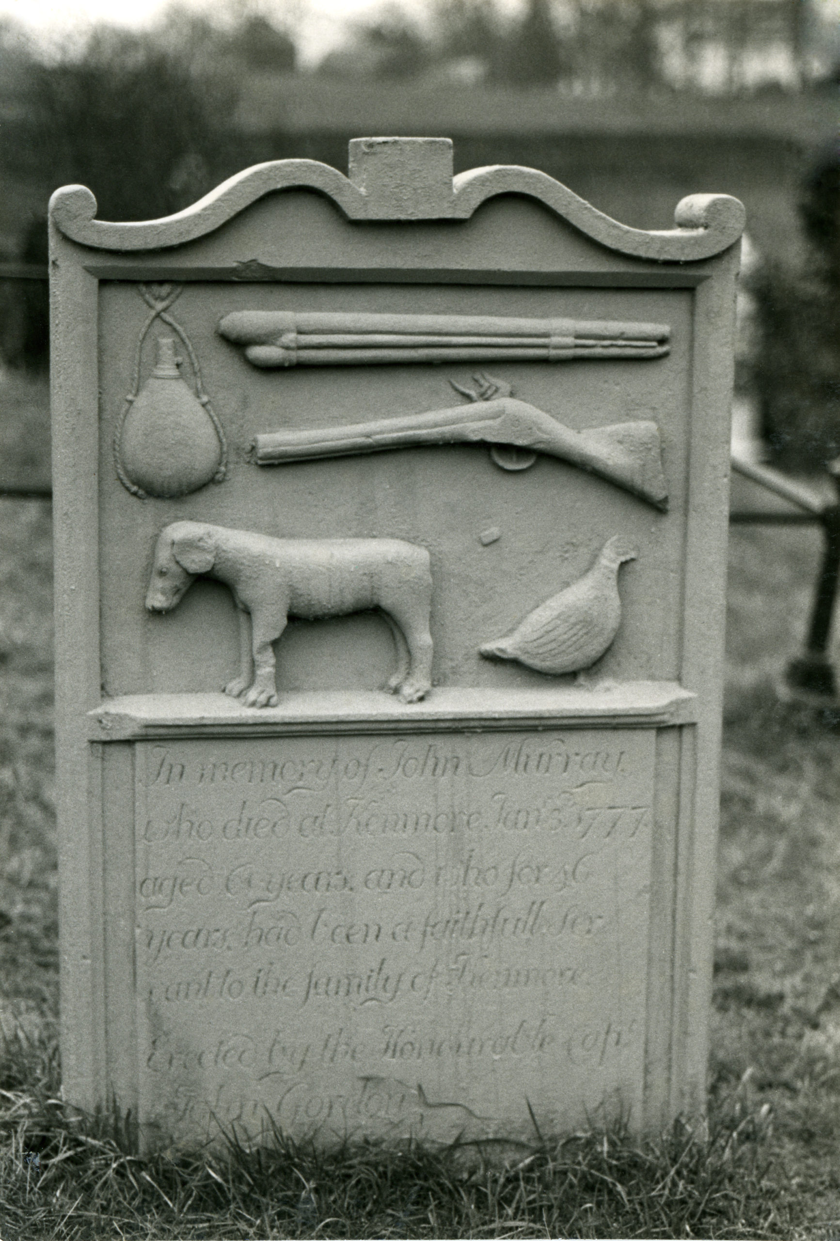 Logan had noted the bas-relief figures on the gravestone (a fishing rod, a gun, a hound, and a powder horn), but had mistaken (as had other writers) the figure of a pigeon for that of a partridge—unlike my friend, Peter Thomas, who spotted the white collar on its neck immediately. On the reverse side of Murray’s tombstone is engraved a poem. It was written by the Rev. John Gillespie, minister of the parish at Kells, who had won a guinea offered (presumably by John Gordon, younger son of Viscount Kenmure) for the most suitable epitaph.