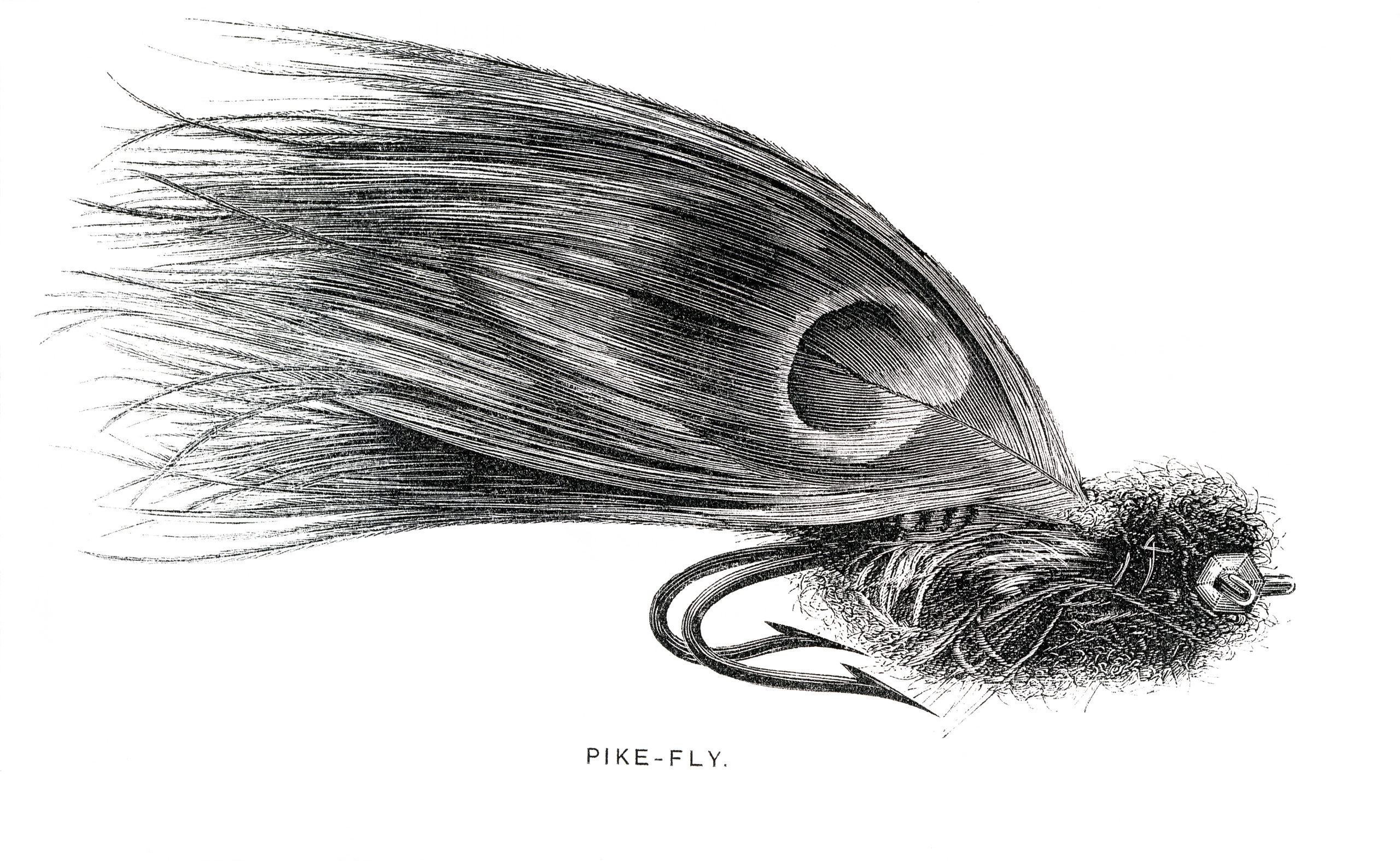Finally, I cannot resist reproducing one of the earliest known illustrations of a pike fly: an engraving made from a drawing of a fly presented to H. Cholmondeley-Pennell. It was published in Pennell’s The Book of the Pike, where he wrote, “The engraving is taken from a very fine specimen of the pike-fly as used in Ireland, and which was presented to me by Mr. Martin Kelly, of Dublin.”19