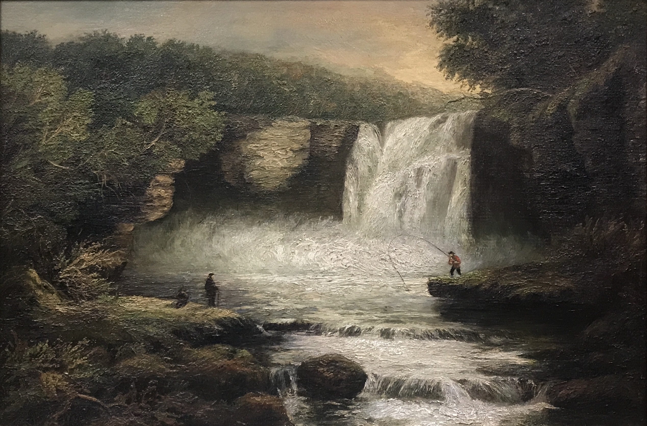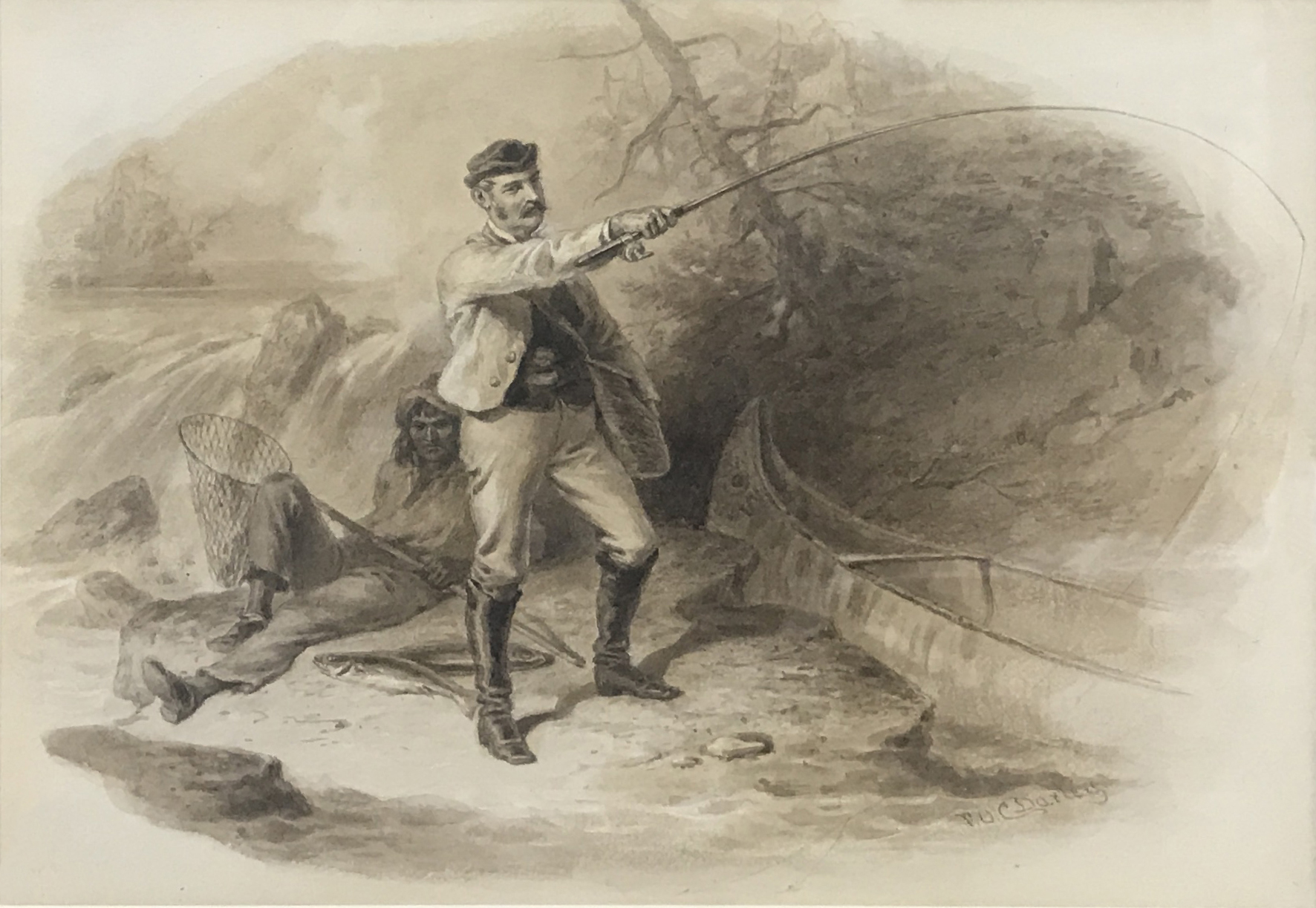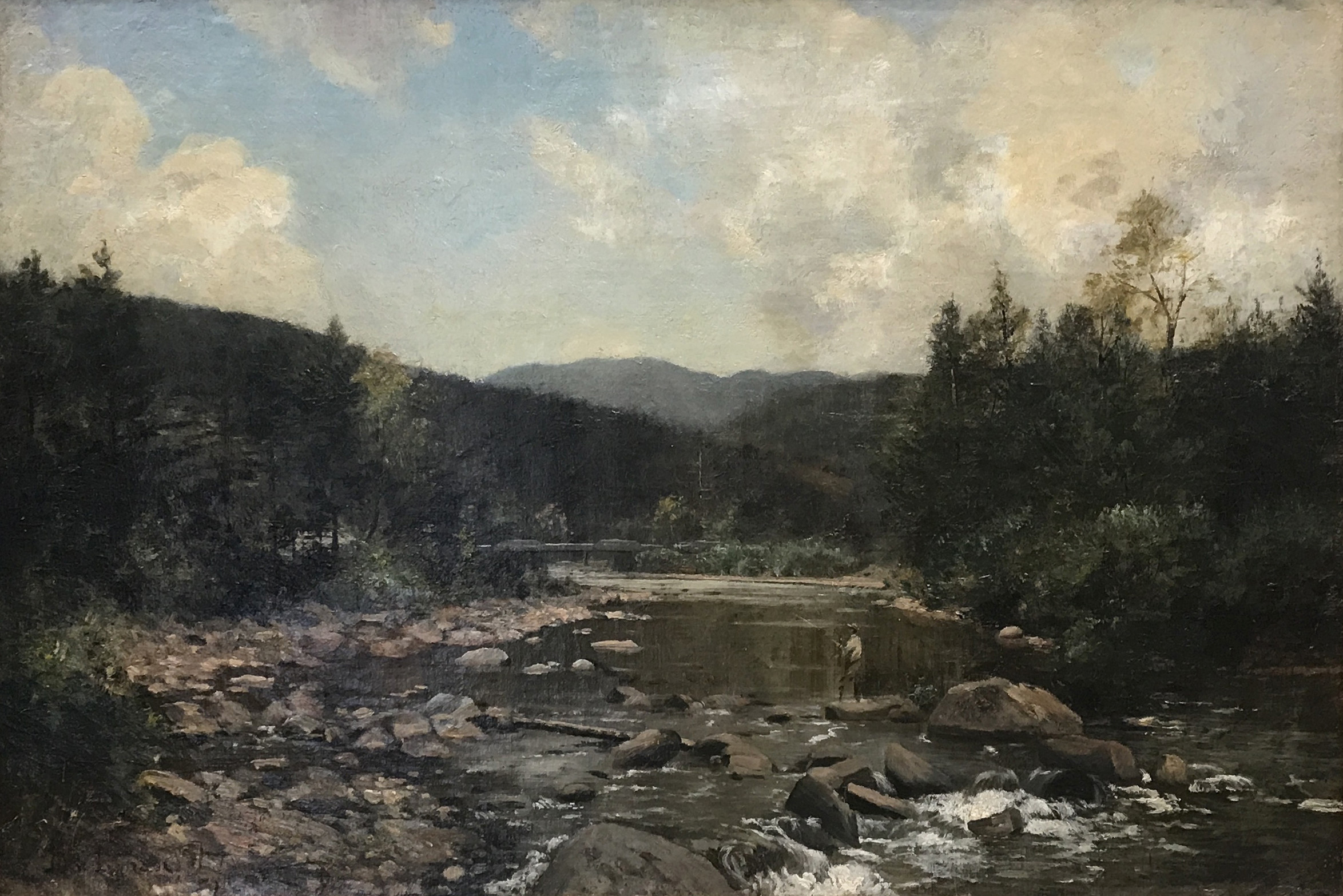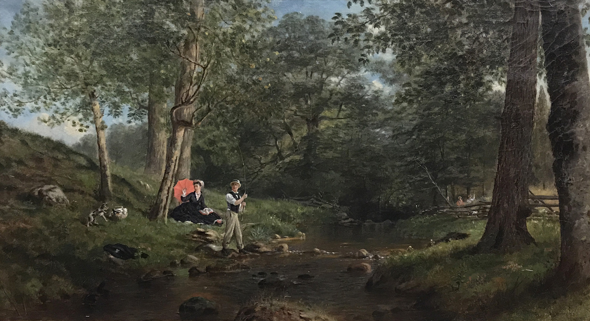 The country’s growing interest in authentic experiences outdoors was mirrored in American art, and artists left their studios to study the scenes and lifestyles in the rural North American wilderness. Following in the steps of European naturalist and realist painters, a growing number of American artists painted en plein air to convey variances in natural light, often including figures of people or wildlife within the landscape to evoke the sensations of being immersed in nature. It seems likely that American artists encountered the angler casting into the rocky streams and wooded lakes of North America, already versed in the landscape that artists were beginning to realize.