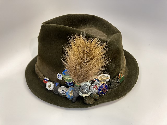 Hat with roebuck trophy brush and assorted badges, worn by Ernest Schwiebert…see more.