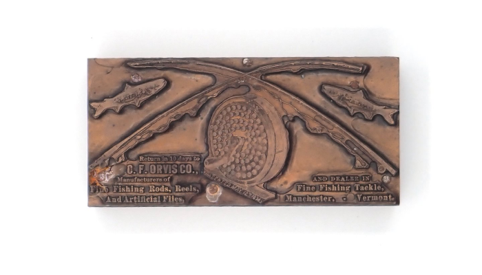 Printing block illustrating two fish and two crossed rods over Orvis 1874 reel…see more.