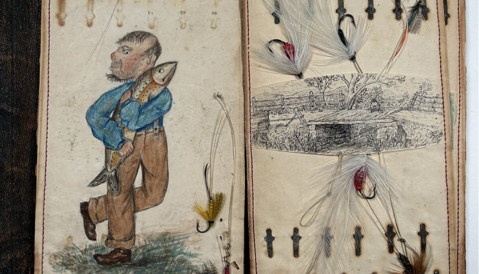 Rectangular, brown leather fly wallet containing 14 ink illustrations and 17 flies…see more.